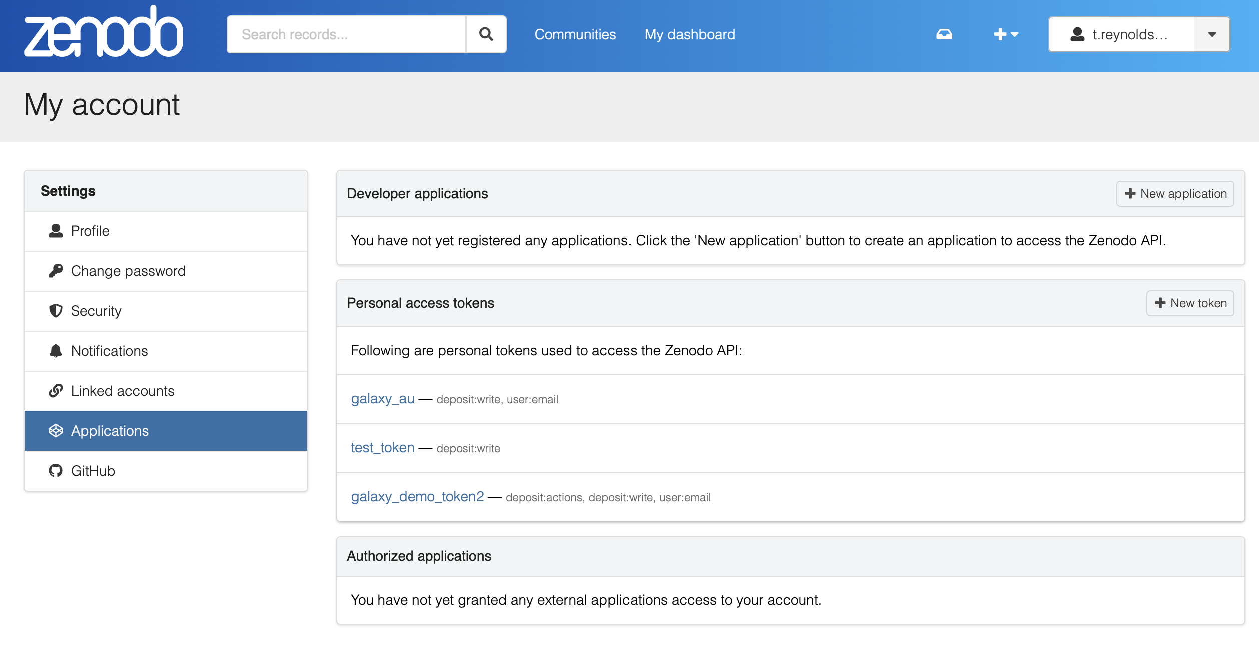 Personal Access Tokenfrom your Zenodo account to Galaxy. To do so, you need to log into your account. Then, visit this site: https://zenodo.org/account/settings/applications/. Alternatively, you can click on your username on top right and then click on “Applications”. Here, you need to create a “Personal Access Token”. This will allow Galaxy to display your draft records and upload files to them. If you enabled the option to export data from Galaxy to Zenodo, make sure to enable the deposit:write scope when creating the token.- Click on